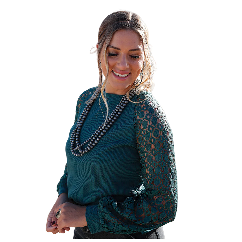 Cruel Girl Women's Knit Top with Crocheted Sleeves in Forest