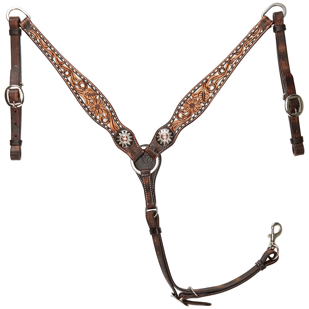 Circle Y Raising Sunflower Breast Collar Chocolate leather Hand-painted sunflower on cream-colored leather underlay Vibrantly painted hand-carved filigree...