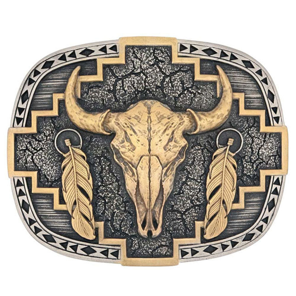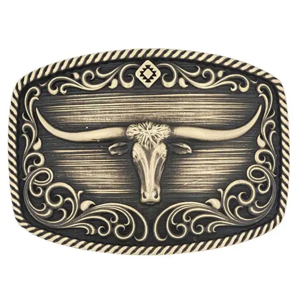 Montana Silversmiths Longhorn Legacy Buckle. Features a sculpted gold tone longhorn at the center, set against a detailed...