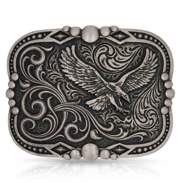 - This buckle features a majestic eagle in the top right corner and dark filigree creates the backdrop