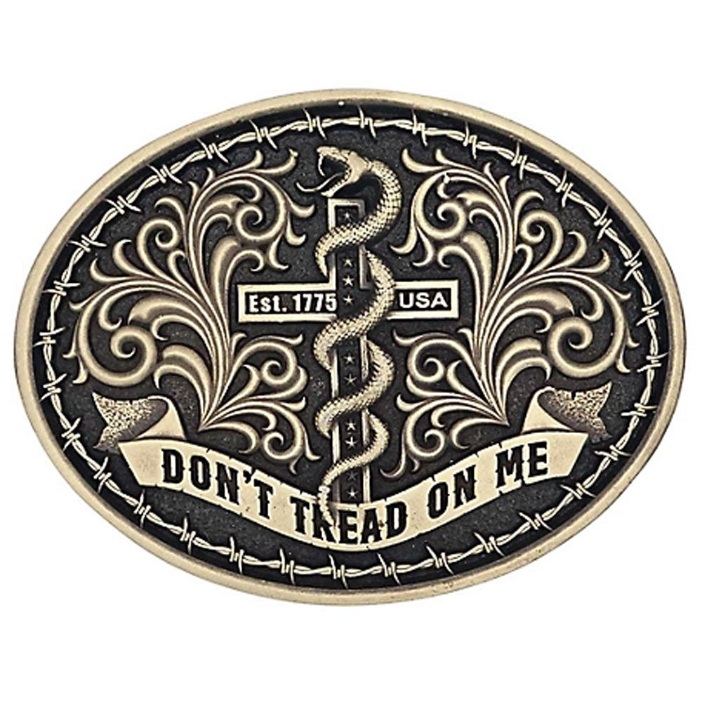 - Montana Silversmiths iconic filigree surrounds the cross and a banner stating "Don't Tread On Me" flows across the bottom.