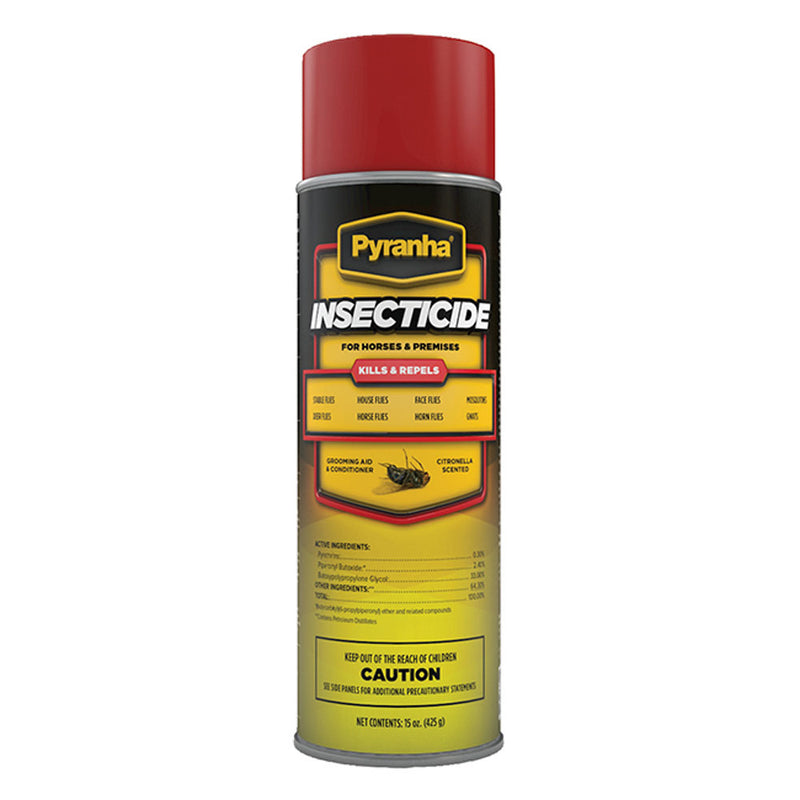 - Piranha Aerosol fly control for horses contains a combination of repellent and natural pyrethrin that provides a quick kill of 13 specific insects, including stable, horse, face, deer, house and horn flies; mosquitoes; gnats; fleas; ticks; chiggers; cockroaches and ants