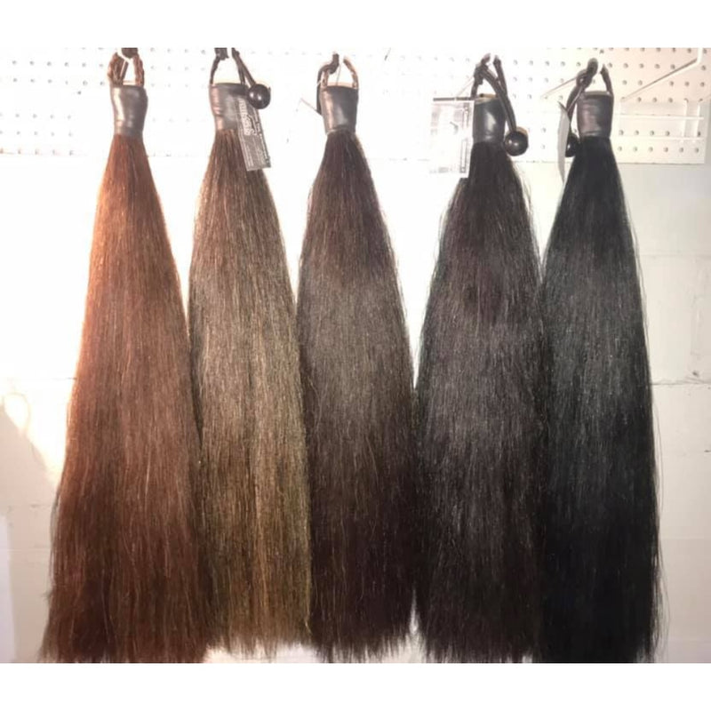 Beautifully Made Weighted Show Tails by AJ. The innovative design offers you two weights to choose from, so you can determine the right weight for your horse. These fake horse tails help enhance the overall fullness and balance of your horse's natural tail. They are great for horses that are 'swishers' or tend to hold their tails outward. Easily braid in the fake horse tail extension with a hair loop attachment, completing your horse's polished look for competitions.