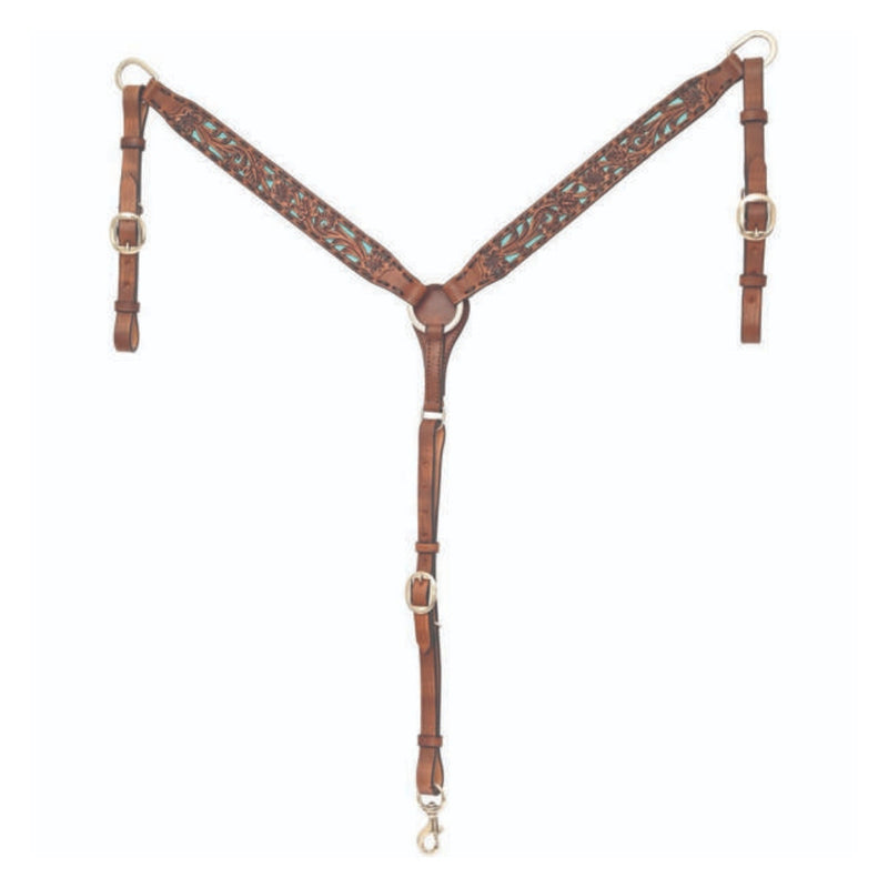 The Carico Breast Collar is not only pretty, featuring careful tooling and unique turquoise inlays, but it is also an essential addition to your tack room