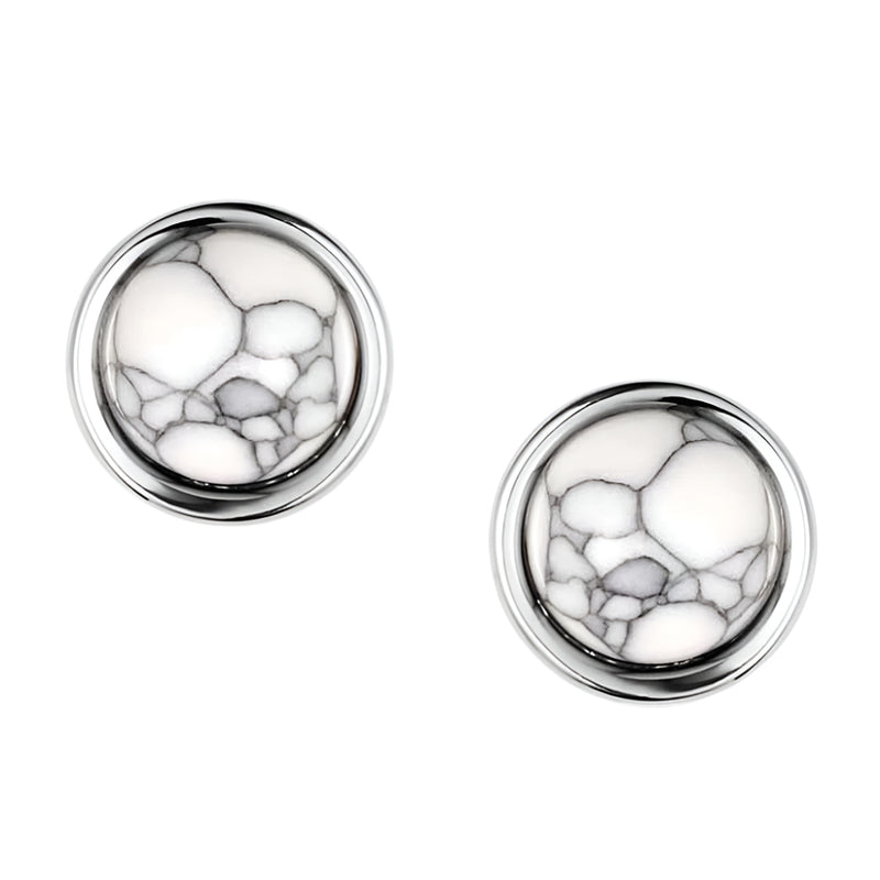 - These Halo Spirit Earrings feature a smooth crafted Howlite stone, known for simple but distinctive veining.