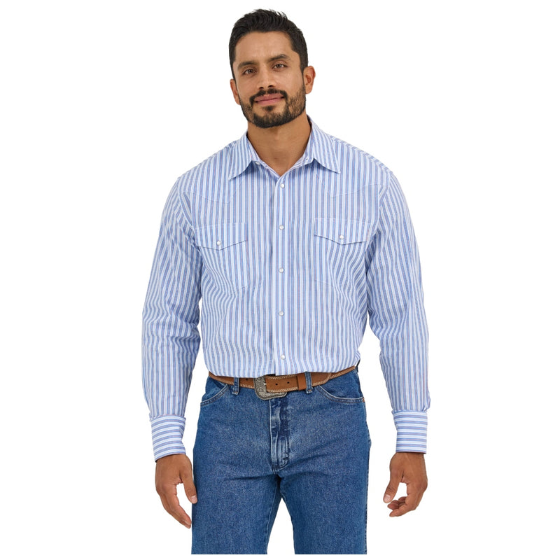 Wrangler Men's Classic Fit Wrinkle Resist Long Sleeve Shirt in Blue & Red Stripe