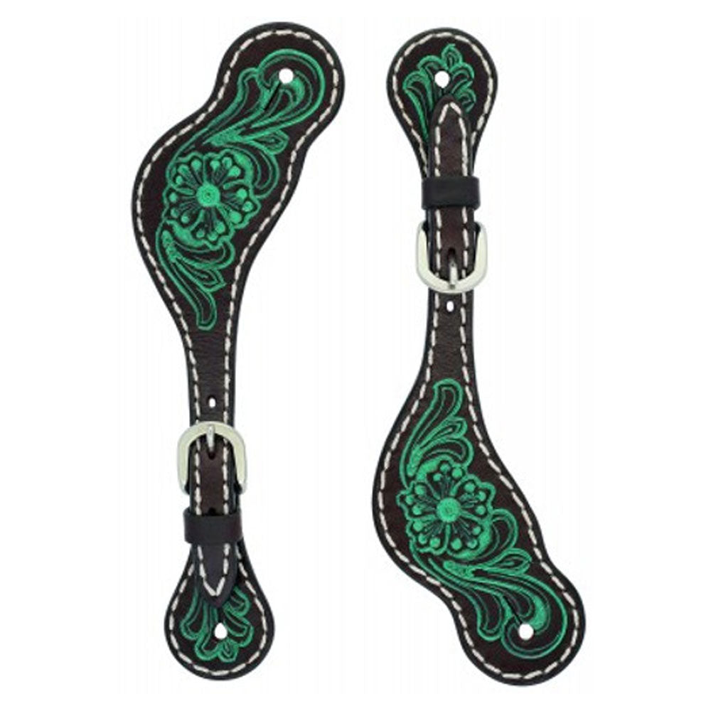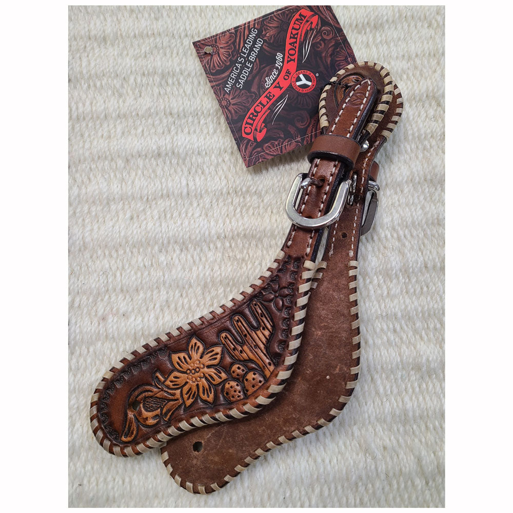 Enhance your riding style with the Carico Ladies Spurs Straps Distressed heavy oil finish Tooled filigree Brown buckstitched...