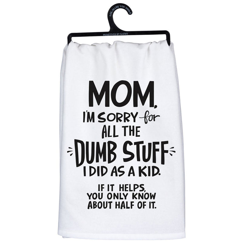 • A cotton kitchen towel featuring a hand lettered "Mom I'm Sorry For All The Dumb Stuff I Did As A Kid If It Helps, You Only Know About Half Of It" sentiment.