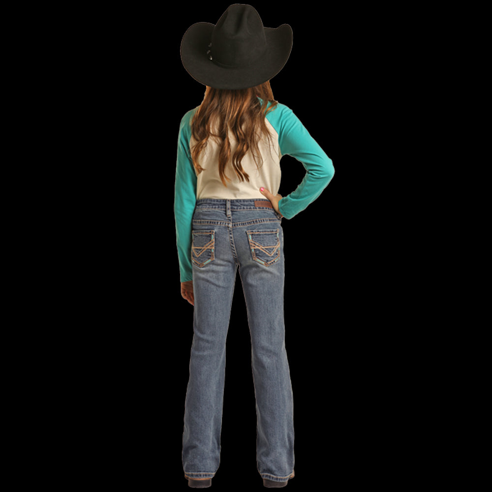 Rock & Roll Girls Bootcut Jean Girls' jean Boot cut Medium wash Aztec inspired embroidered back pockets Extra...
