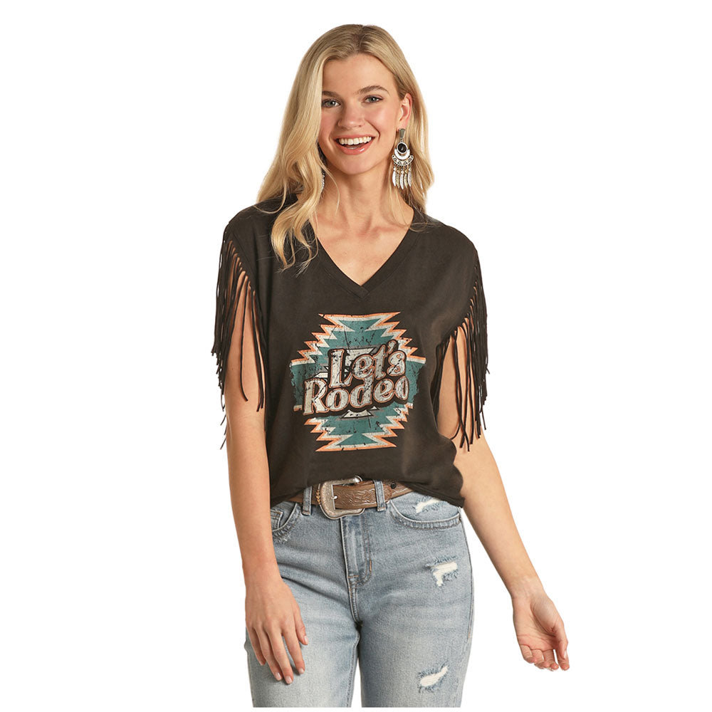 Rock & Roll Cowgirl Juniors Sleeveless "Lets Rodeo" Tee Graphic sleeveless top Self fringe "Lets Rodeo" graphic on the front...