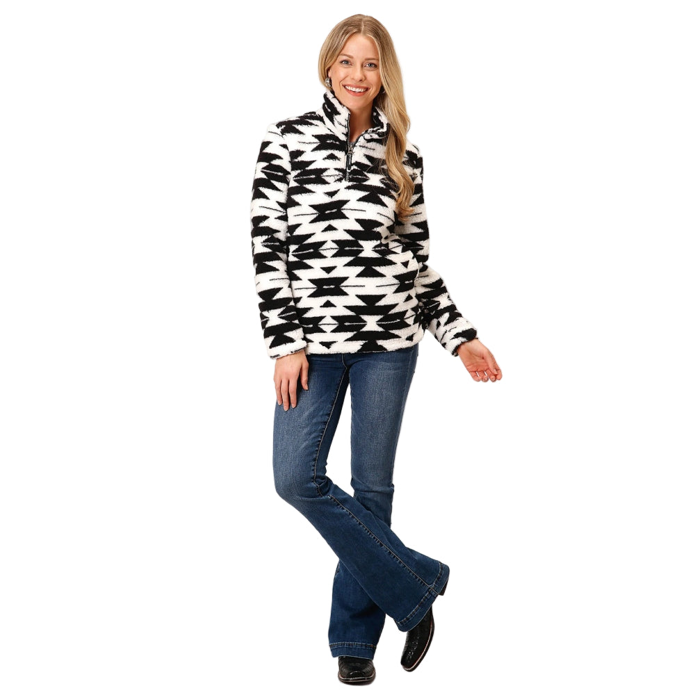 03-098-0250-6195 Roper Women's Polar Fleece 1/4 Zip Pullover - Black & White Aztec