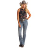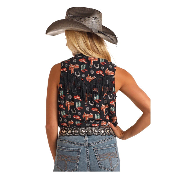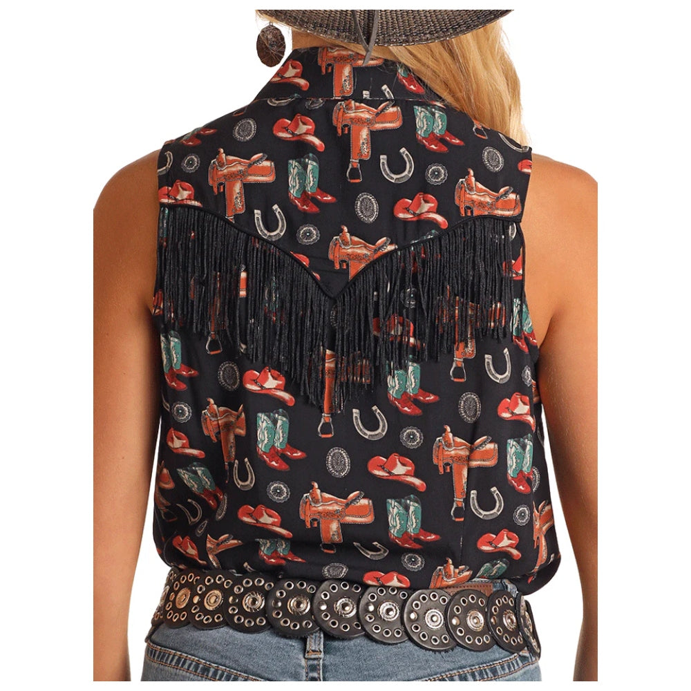 Rock & Roll Women's Sleeveless Conversational Snap Shirt in Black Cowgirl Print