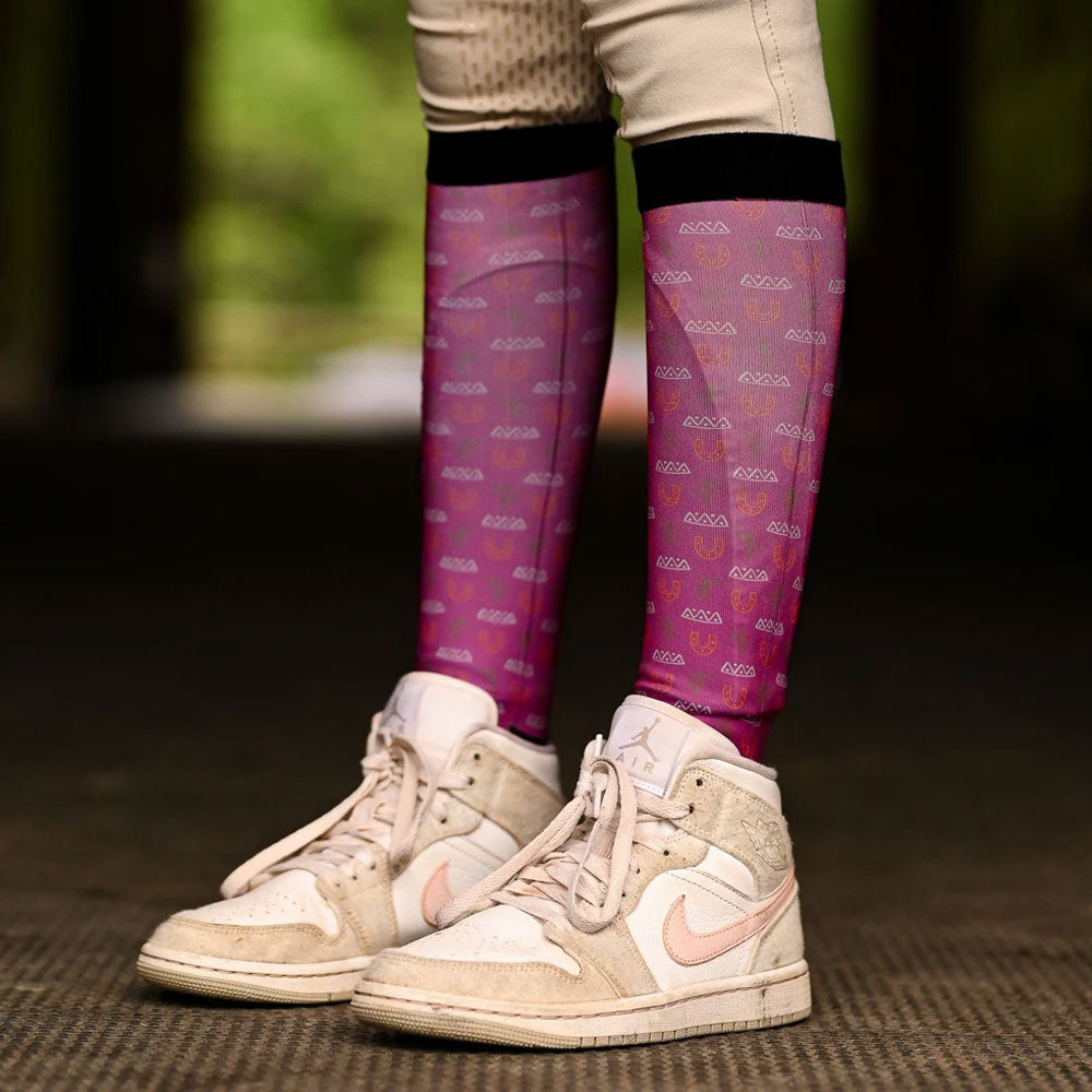 Dreamers & Schemers Desert Rose Boot Socks Pair & A Spare. Eggplant background with horseshoes, cactui & desert...