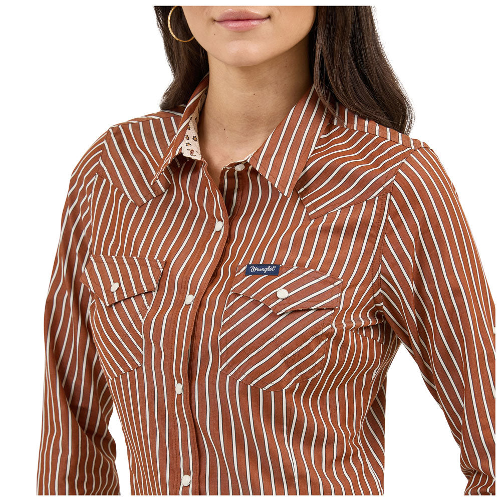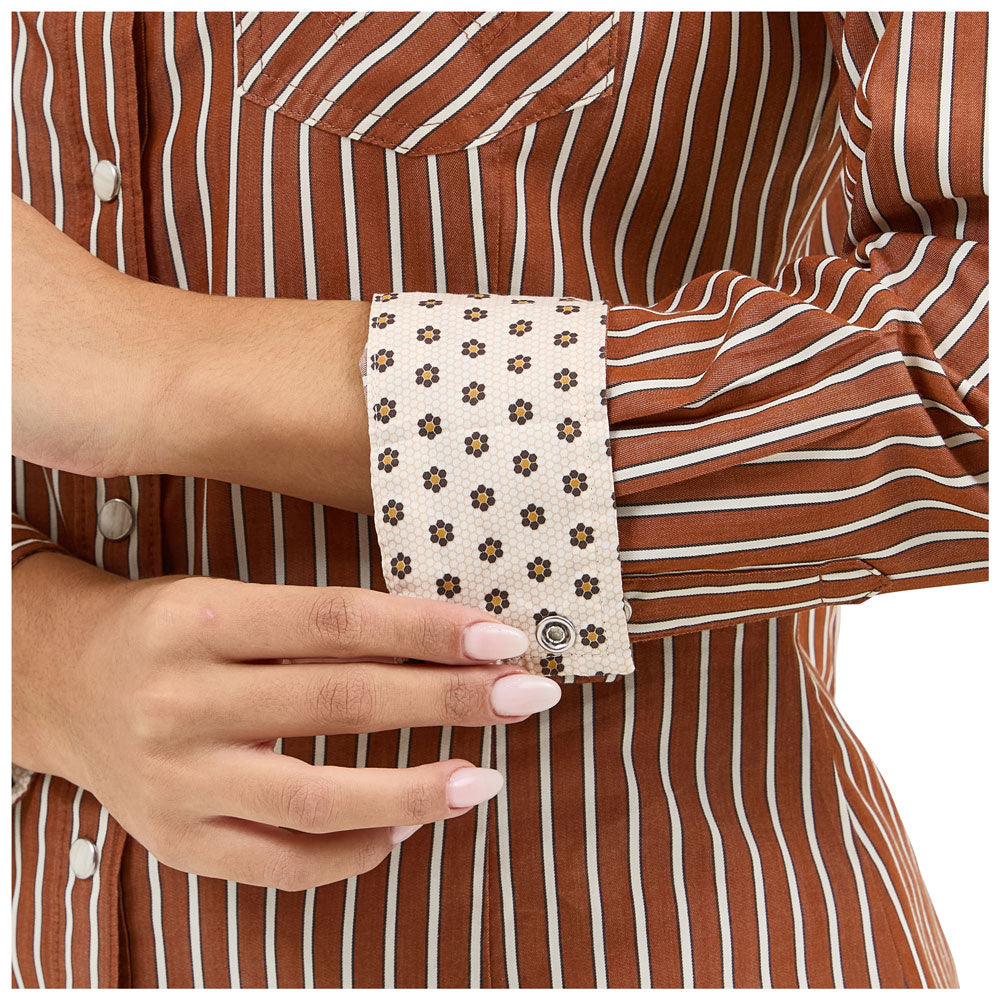 Wrangler Women's Retro Western Dress Long Sleeve Snap Shirt in Rust Stripe
