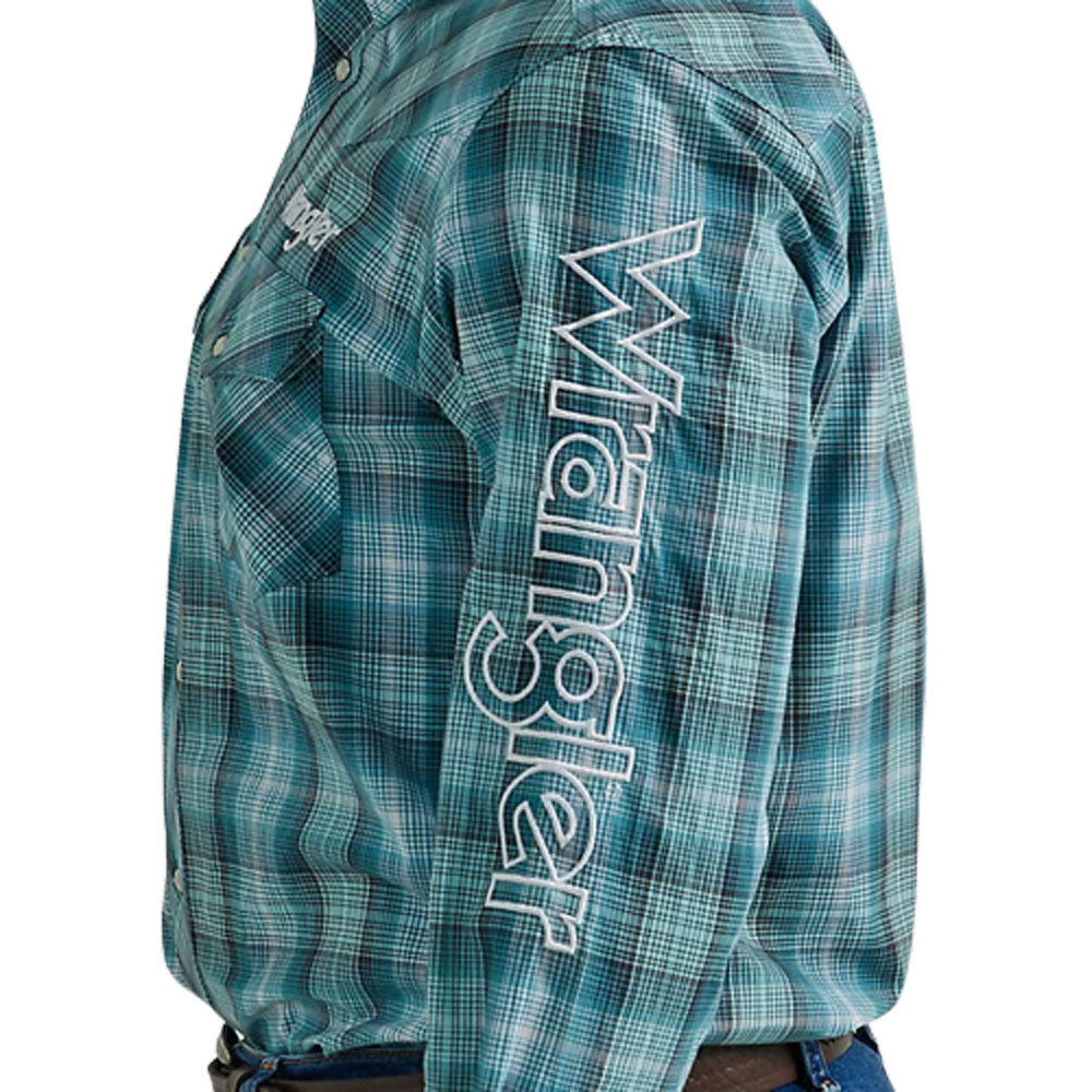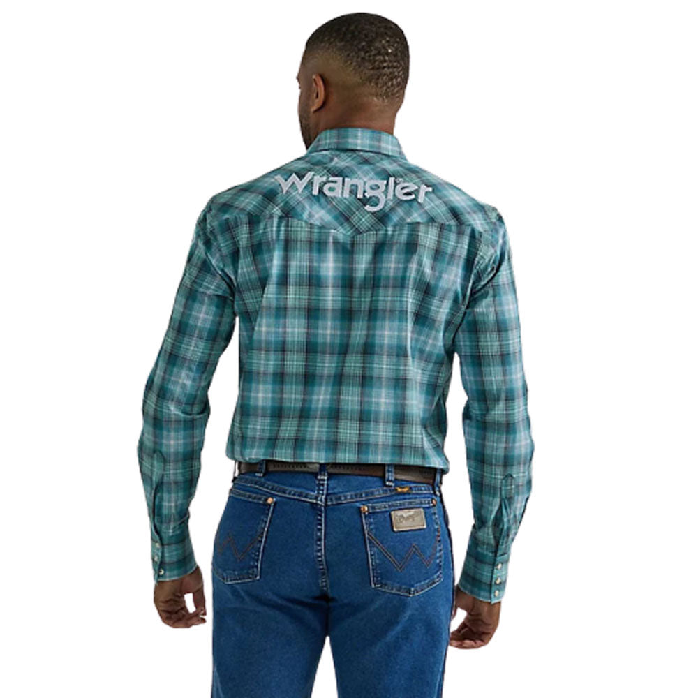 112330339 Wrangler Men's Long Sleeve Logo Western Snap Shirt - Turquoise