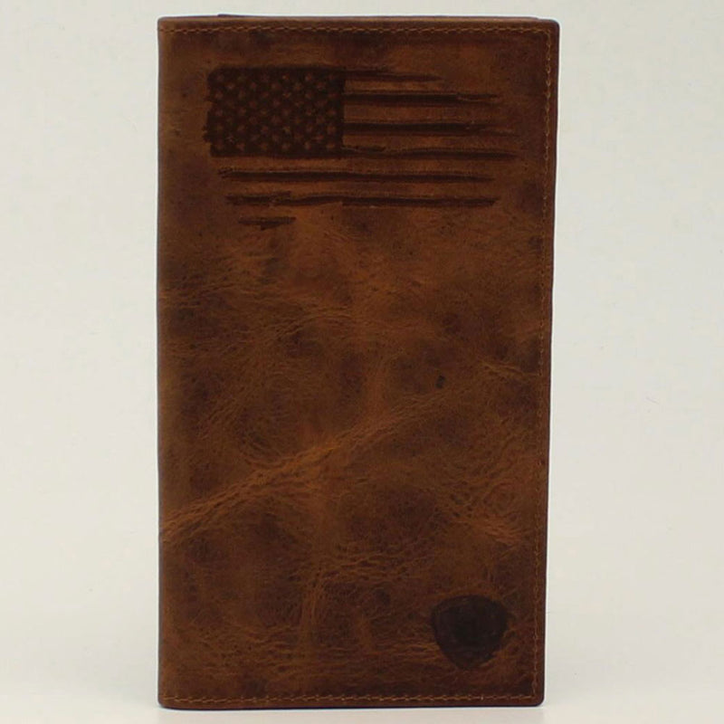 Keep your checkbook, credit cards and cash organized in one place with this Ariat rodeo wallet by M&F Western Products. Distressed USA flag stitched on the front with an Ariat shield logo stamped on bottom corner. This great wallet is made of genuine leather and features multiple compartments for your credit cards, cash, and an ID window.