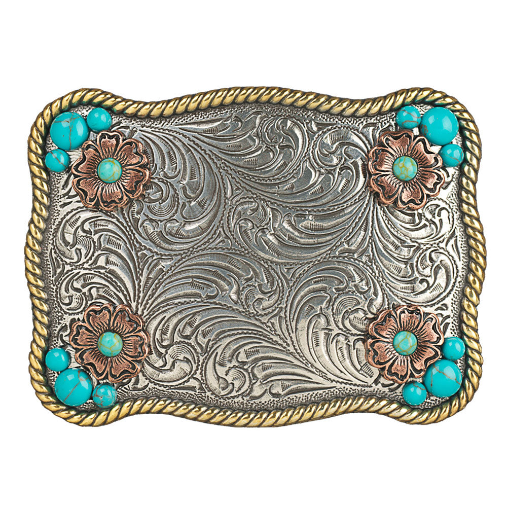 37929 Blazin Roxx Rectangle Flower Western Belt Buckle With Turquoise