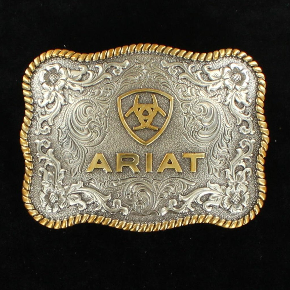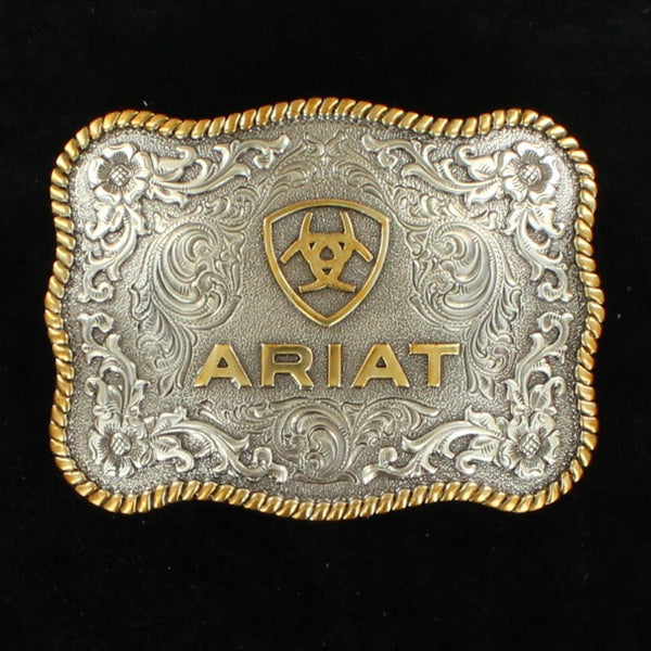 This large scalloped shape buckle by M&F Western Products features an Ariat logo design. The background is detailed with flowers and scrolls with an added filigree to give depth. Accented with a twisted rope trim.