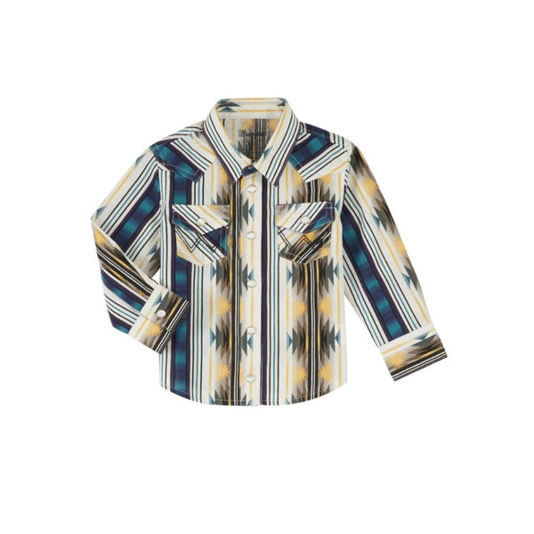 PQ1290M Wrangler Baby Blue, Purple, Tan, and Yellow Navajo Print Snap Western Shirt