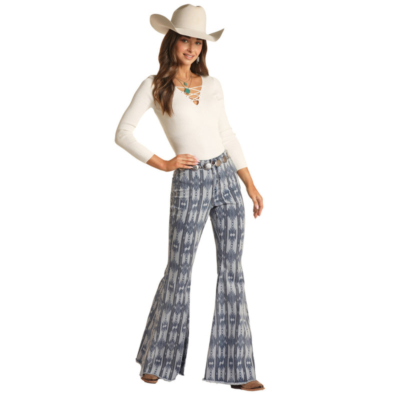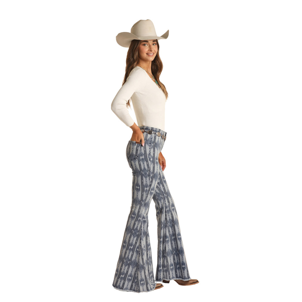 RRWD7PRZRF Rock & Roll Women's Blue Aztec High Rise Bargain Bell Bottom Flare Jeans