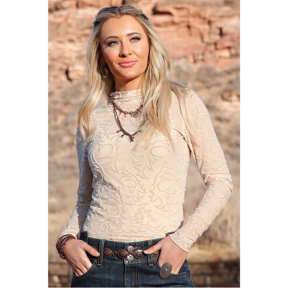 Cruel Girl Women's Long Sleeve Burnout Mock Neck Top in Cream
