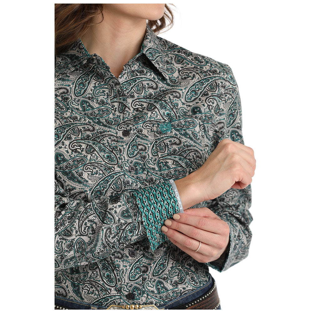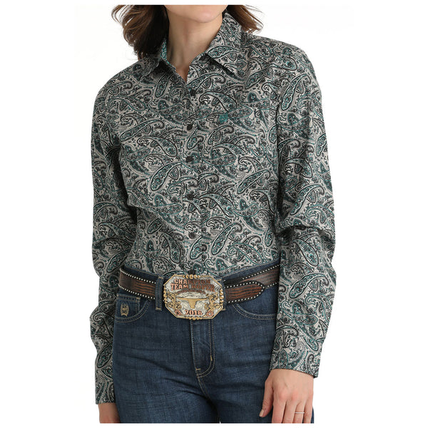 MSW9164223 Cinch Women's Long Sleeve Western Button Shirt - Grey & Green Paisley Print