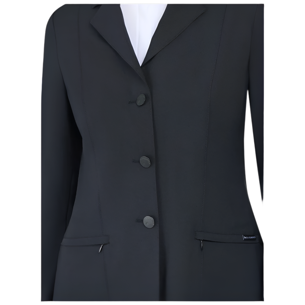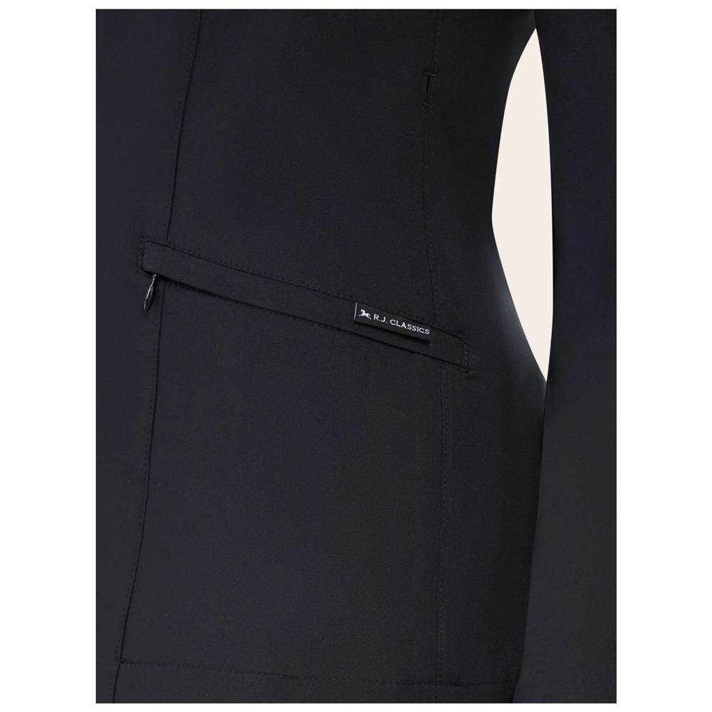 RJ Classics Women's Sloane Show Coat in Black. The Sloane show coat brings tradition and ultimate comfort at our most accessible price point. Featuring an unconstructed design for freedom of movement and a comfort stretch fabric, you will feel comfortable and confident walking into any show ring.